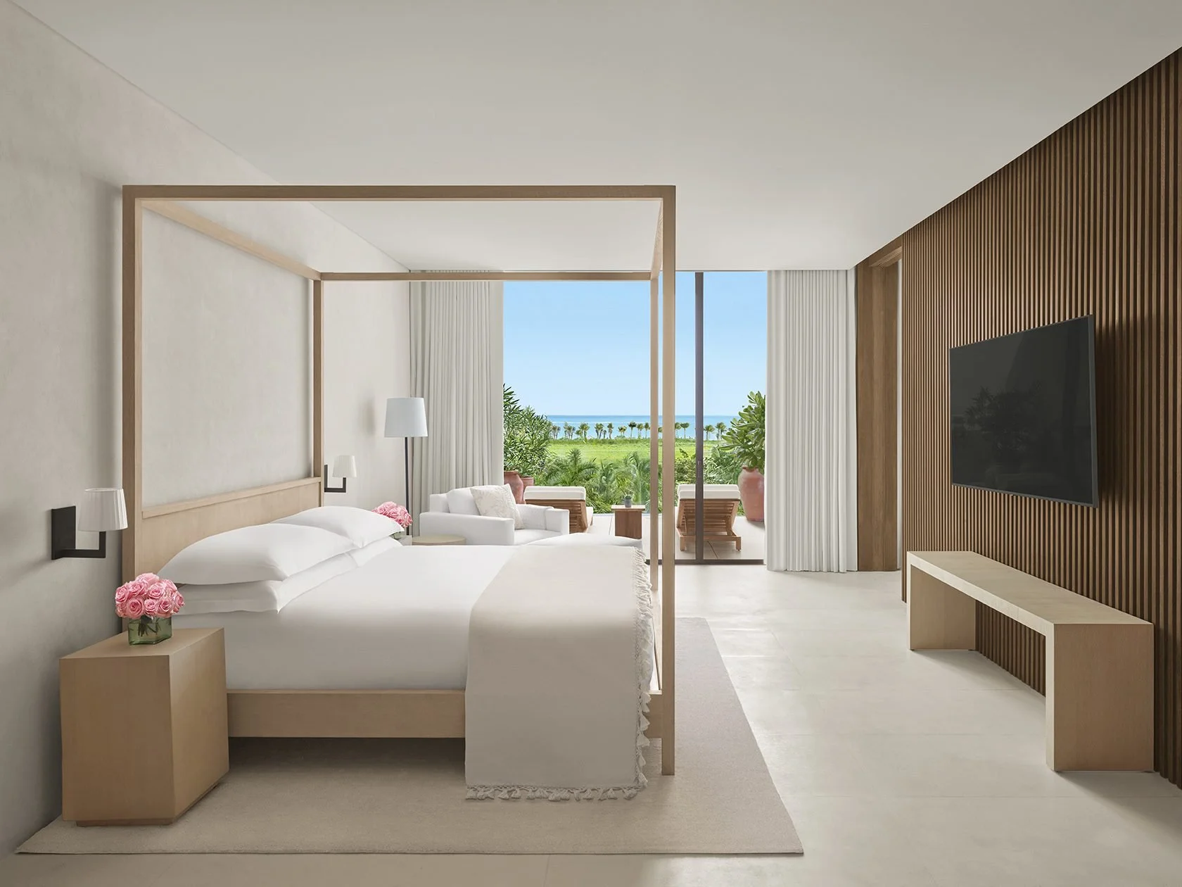 In every guest room, light and airy materials and colors create a calm oasis. Slatted wood paneling, reminiscent of the screens in the lobby but on a finer and more delicate scale, enclose the large bathrooms, entered through 5-foot-wide sliding doors, ensuring the bath and living spaces flow into one another. Custom four-poster beds, bespoke lighting, nightstands and a curved sofa create an intimate sleeping area and allow the furniture to segment the large-scale space and create softness.