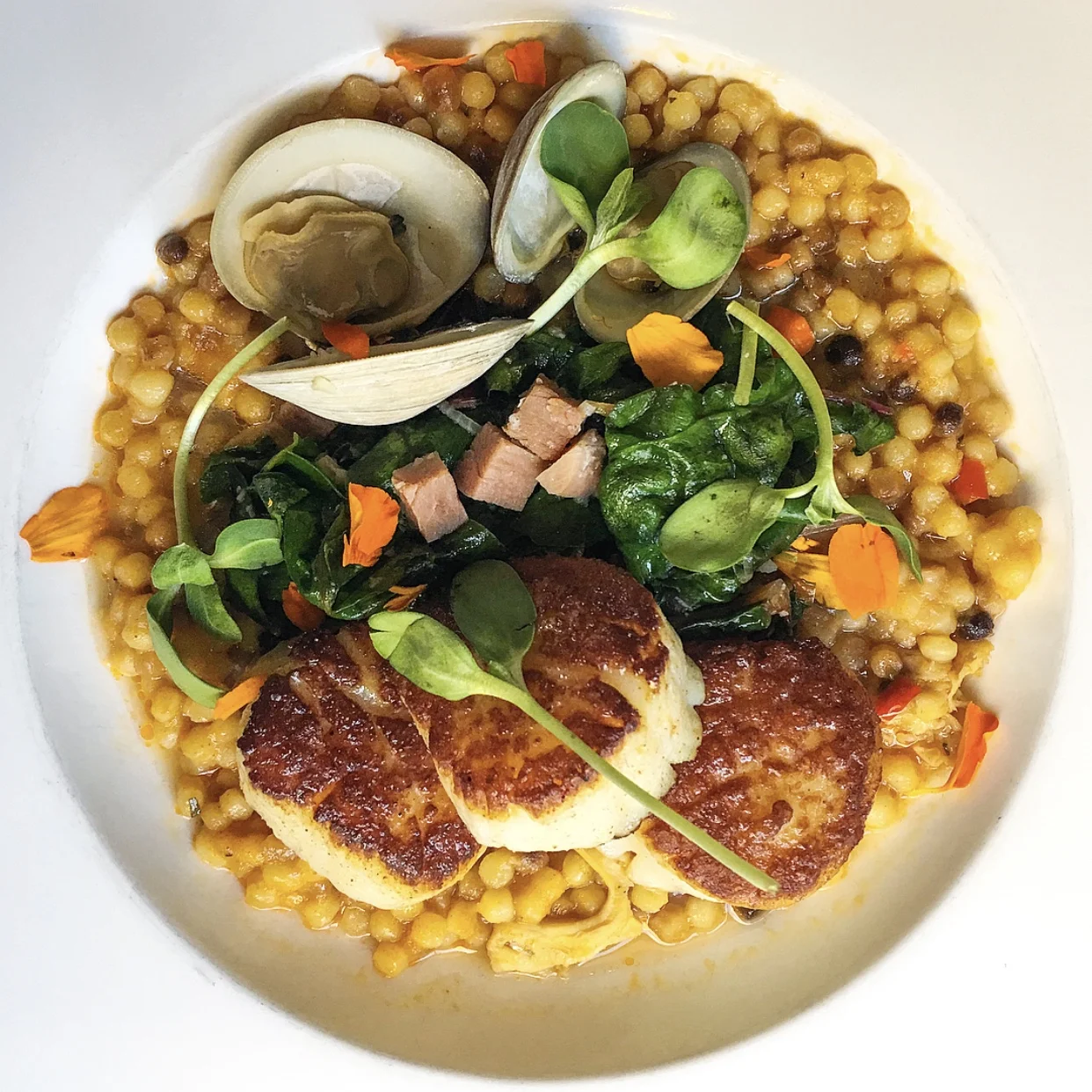 The sea scallops, seared to perfection, sat atop succulent shellfish broth-marinated Italian fregola pasta, blended with Eastern shore clams, Kite’s country ham (a local specialty) and Swiss chard. So good.