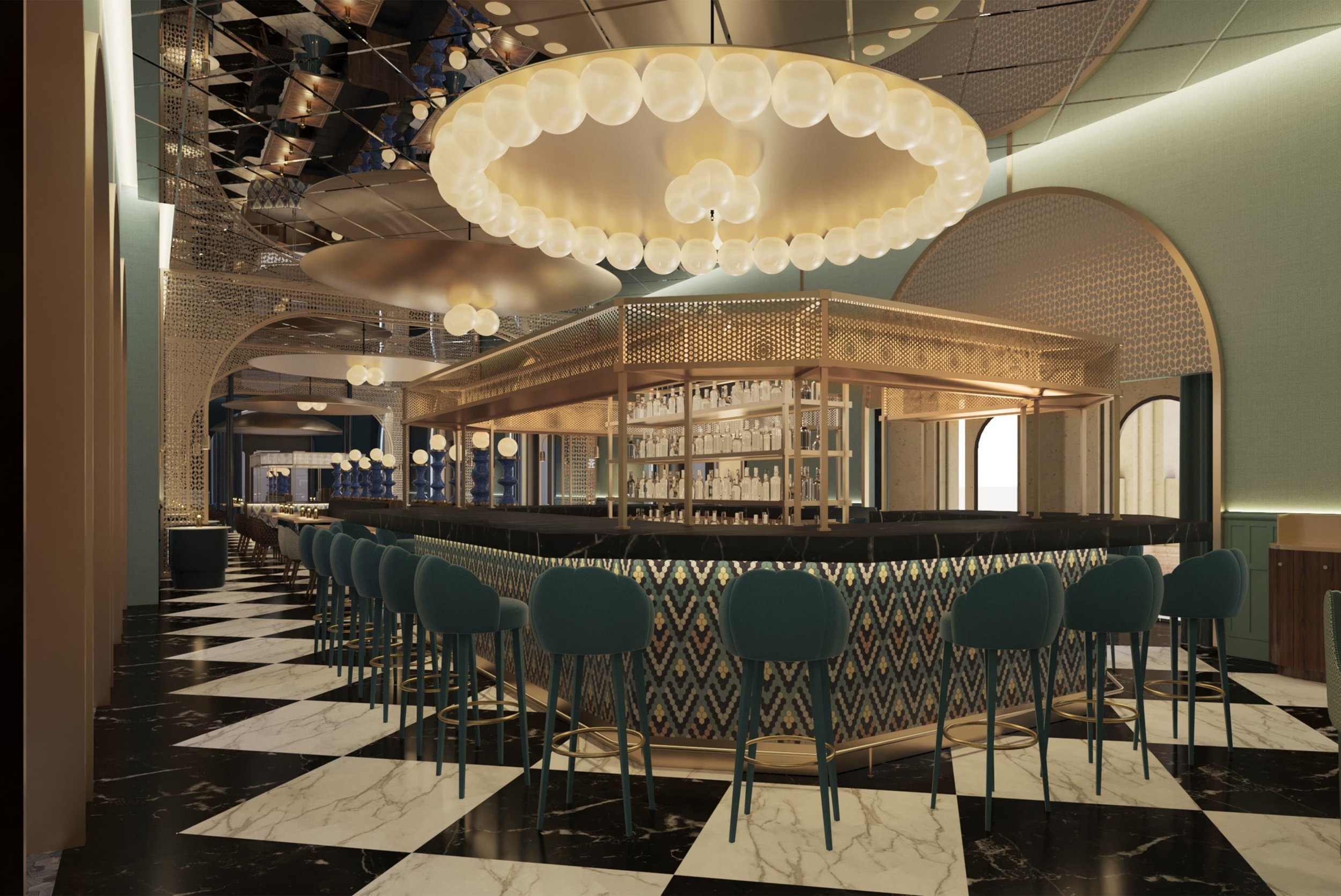 Further inspiration has been sourced from the grand French Renaissance architectural aesthetic throughout the city, leading to a spirited modernization with color palettes of green, coral and deep blues and paired with contemporary Zsolnay inspire tiles, stained glass features and jewelry-inspired light fittings. Hungary’s vibrant and eclectic cultural scene, including the city’s famous love of chess and deep-rooted connection to ballet, can also be seen throughout the new hotel. Subtle nods to both are expressed in the form of bespoke chess-piece lamps and monochrome tiled marble flooring or soft pink hues, curved lines and lighting inspired by the graceful fluidity of the dance form. A few of Hungary’s most famous exports, Harry Houdini and Zsa Zsa Gabor, have sparked a creative vision for the interior concept, expressed using mirrors to create optical illusions and nostalgic touches of Hollywood glamour.